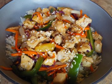 Choice of Cilantro Lime Rice or Quinoa & Kale Blend, Onion, Bell Pepper, Pineapple, choice of Asian Sesame, Sweet Chili or Teriyaki Sauce and Sesame Seeds.