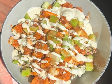 Choice of Cilantro Lime Rice or Quinoa & Kale Blend, Creamy Queso, Bleu Cheese Crumbles, Crispy Chicken, Celery, Choice of Wing Sauce, Ranch Dressing
